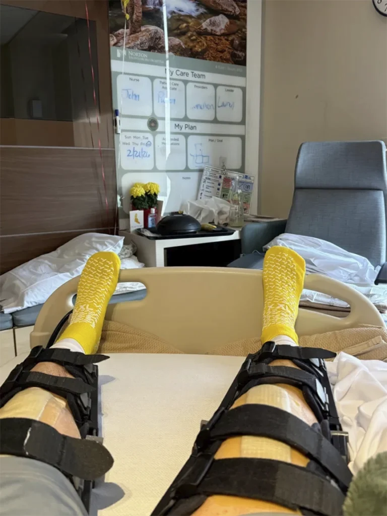 Mi esposa y mis amigos finalmente me llevaron a emergencias, donde, providencialmente, fui admitido de inmediato gracias a una amiga enfermera que estaba de turno. A la noche siguiente, una resonancia magnética mostró que había roto completamente ambos tendones del cuádriceps. Después de una cirugía de dos horas el jueves, pasé diez días en el hospital. Luego fui trasladado a un centro de rehabilitación intensiva durante nueve días, antes de finalmente regresar a casa.