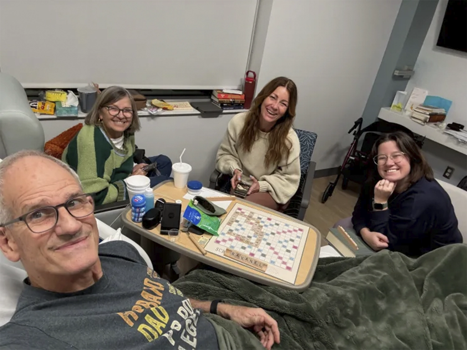 Tan pronto como McKenzie, nuestra única hija que vive cerca, se enteró de lo sucedido, fue rápidamente a la sala de emergencias y se quedó varias horas. Cuando algunos de nuestros hijos que viven fuera de la ciudad supieron de mi accidente, hicieron planes para viajar a Louisville en distintos momentos para estar con nosotros. Una vez aquí, tuvimos conversaciones que de otro modo nunca habríamos tenido. Reímos, recordamos momentos pasados, compartimos en comunión (e incluso jugamos un poco de Scrabble).