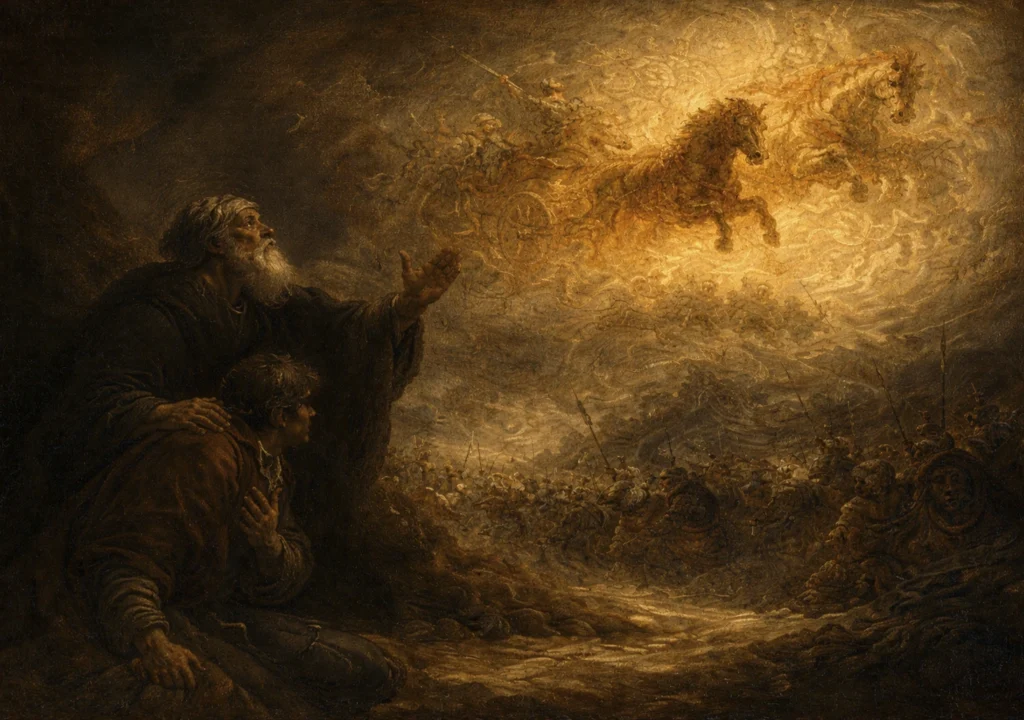 Abrumados por las hordas de enemigos que los rodeaban en la batalla, el siervo de Eliseo dice: “¡Ah, señor mío! ¿Qué haremos?” (2R 6:15). Elías intercede por su sirviente, y Dios le concede al jóven espectáculos celestiales al ver los caballos invisibles y los carros de fuego.