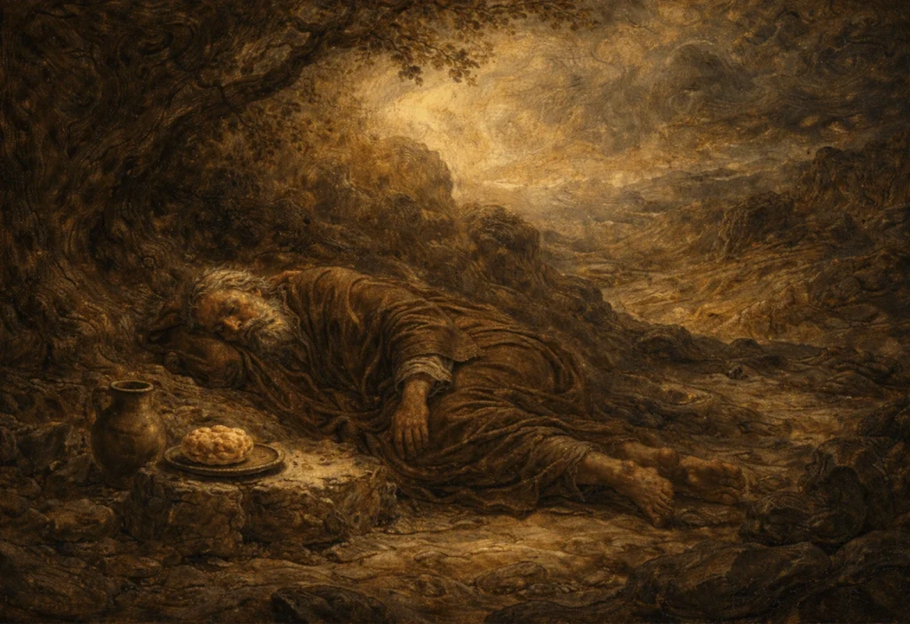 Abrumado por la montaña rusa del ministerio, Elías desea morirse. Habiendo celebrado la victoria de Dios sobre Baal recientemente, ahora él está escapando por su vida. Elías suplica en el desierto: “Basta ya, Señor, toma mi vida porque yo no soy mejor que mis padres” (1R 19:4). No una vez, si no dos, Elías se queda dormido (como las personas abrumadas también lo hacen), y Dios lo despierta ambas veces con el almuerzo en lugar de sermones o retos; tortas cocidas en piedras calientes y una vasija de agua.