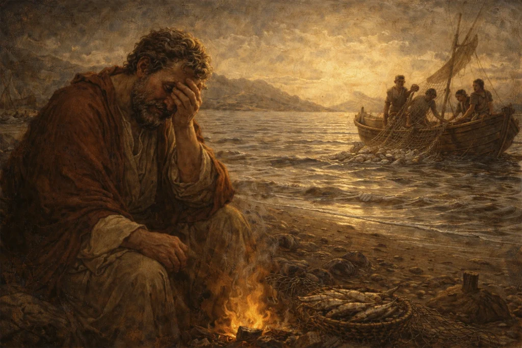 Abrumado por negar a Cristo tres veces cuando juró defenderlo hasta la sangrienta muerte, Pedro llora (Mt 26:75). Él piensa que podría llorar por la eternidad. Hasta que Jesús se aparece ante él en la costa. No es casualidad para Pedro que esta escena de pesca sea similar al felíz día en que Jesús lo llamó, pidiéndole que lo siguiera (Lc 5:1-11). El mundo de Pedro cambia a medida que Jesús lo interroga. Tres veces Jesús le pregunta a Pedro si lo ama, cada pregunta más incisiva que la anterior, más, más dura que cualquier atracción a la pesca en su corazón (Jn 21:15-17).